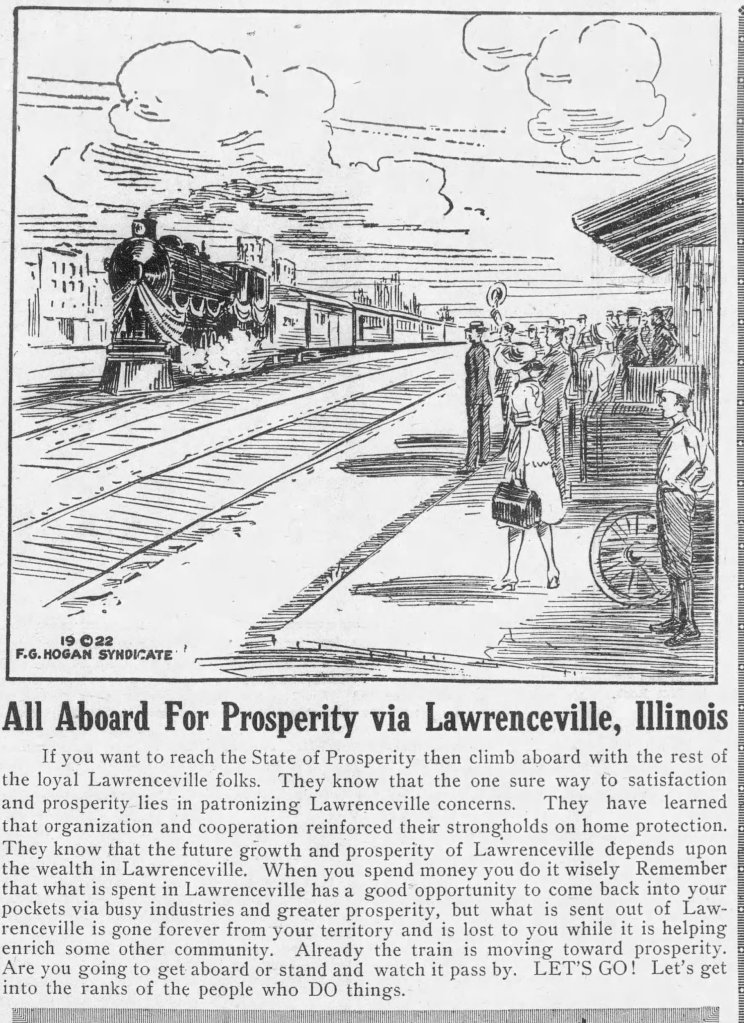 Precursors to the “Be Loyal to Huntsville” week appeared at least a year earlier with an advertisement titled “All Aboard For Prosperity via Greater Huntsville.”3 The train to prosperity passing through the city was an iconic image, one that its creators used often in their advertisement campaigns. The national market forced cities to not only compete with one another for business, but to try and differentiate themselves as places of commerce and opportunity. It is ironic that so many towns turned to the same advertising firm to highlight their unique characteristics. The F.G. Hogan Syndicate operated out of Kane, Pennsylvania and literally drew up the template that towns nationwide used to try to sell themselves to locals and outside businessmen.