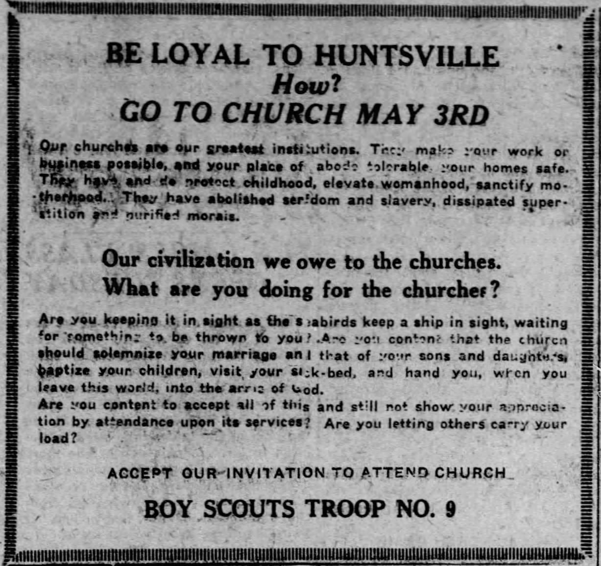 The Huntsville Times May 8, 1925. The Holmes Street Methodist Church drew parallels between familial love, church attendance, and hometown loyalty.
