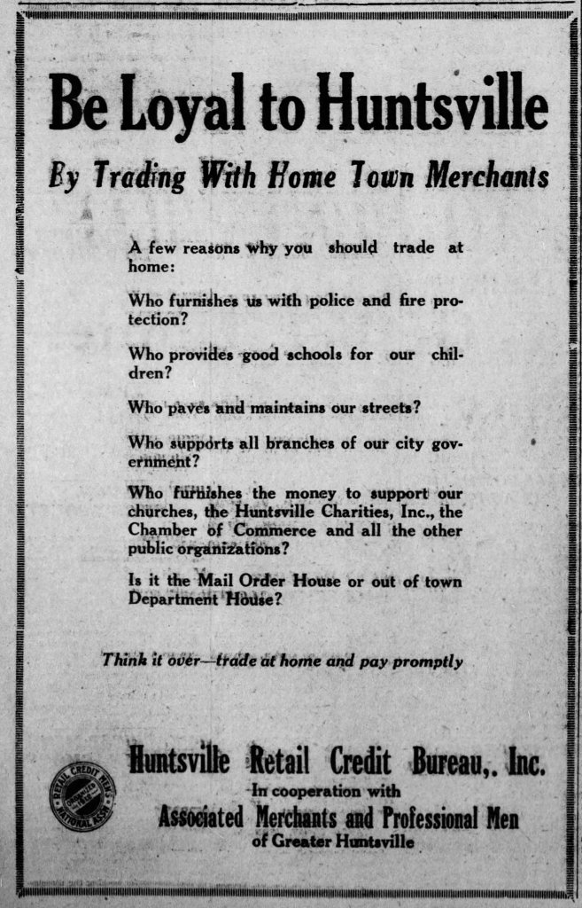 To be certain there were previous exhortations to the “loyal citizens of Huntsville” throughout the years. Whenever the city hosted a large conference or had visiting dignitaries, local newspapers called for the city to present itself well. Yet these previous instances were about putting forward the best possible face to visitors and outsiders. It was only after the commercial pressures presented by competing firms in nearby cities, retail franchising, and the ever-present threat of the Sears catalog that resident elites began pressuring the people of Huntsville to show their hometown pride by meeting their consumption needs from local merchants first.2